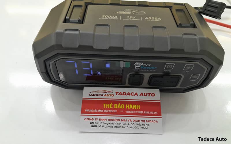 - Kích nổ ô tô Green Keeper 4000A được trang bị màn hình LED sắc nét giúp dễ dàng quan sát dung lượng phần trăm pin khi cần thiết. Ngoài ra bộ kích bình còn được trang bị đèn LED chiếu sáng ban đêm, đèn khẩn cấp SOS thông minh khi gặp sự cố.
