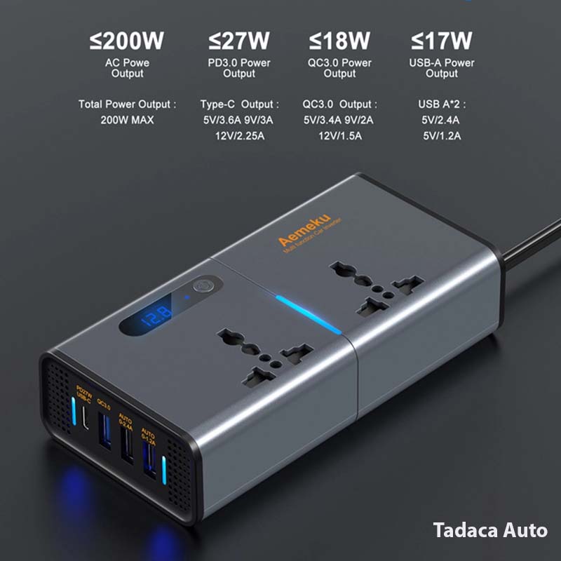 - Bộ chuyển nguồn 12V sang 220V Aemeku 200W được trang bị 2 cổng nguồn điện xoay chiều AC có công suất tối đa là 200W bạn có thể sử dụng các thiết bị như: Laptop, sạc điện thoại, đèn chiếu sáng, quạt điện…. rất đa năng, phù hợp khi đi du lịch, picnic…