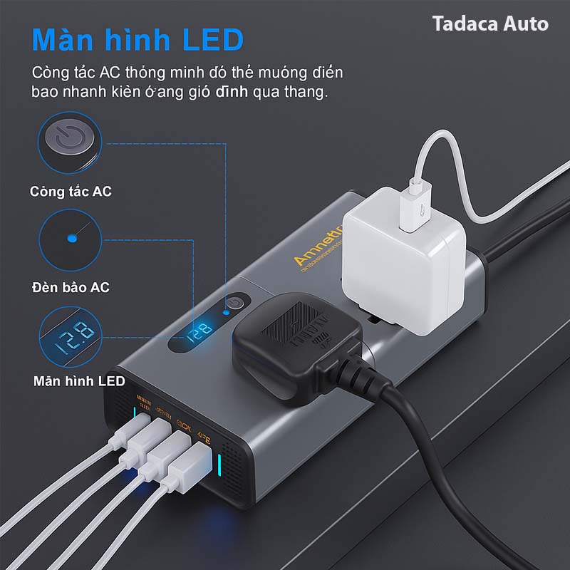 - Bộ chuyển nguồn 12V sang 220V Aemeku được trang bị màn hình LED hiển thị điện áp giúp bạn dễ dàng quan sát được tình trạng điện của ắc quy. Với thiết kế nhỏ gọn dễ dàng để trên xe mà không chiếm nhiều diện tích, thân máy được làm từ nhựa ABS nên có độ bền cao.