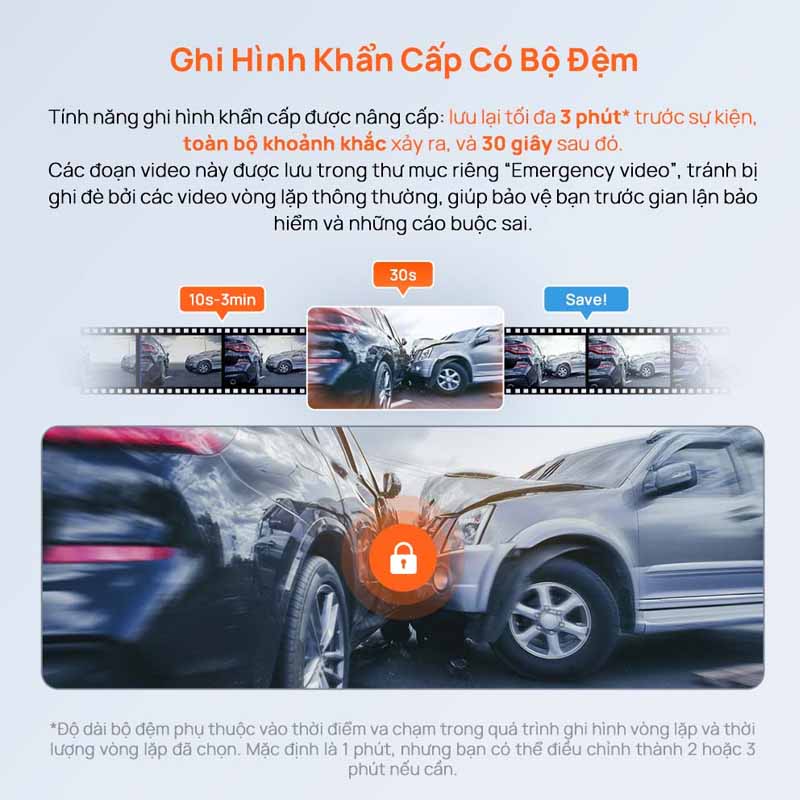 - Cơ chế ghi hình khẩn cấp: 2 giây trước va chạm + 28 giây sau va chạm.