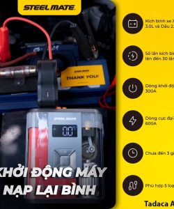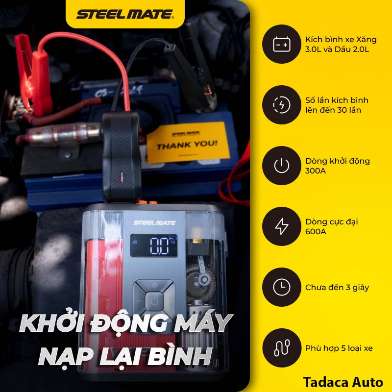 - Kích bình đa năng Steelmate V12SE có ưu điểm nổi bật kích bình bơm lốp đa năng V12SE nằm ở sự kết hợp hoàn hảo giữa công suất và tính di động. Với dung lượng pin 8.800mAh, dòng khởi động 300A và dòng cực đại 600A, thiết bị dễ dàng kích nổ các động cơ xăng ≤ 3.0L và diesel ≤ 2.0L. Thiết kế nhỏ gọn giúp người dùng dễ dàng mang theo trong cốp xe, đặc biệt phù hợp với xe gia đình, SUV cỡ nhỏ và xe máy.